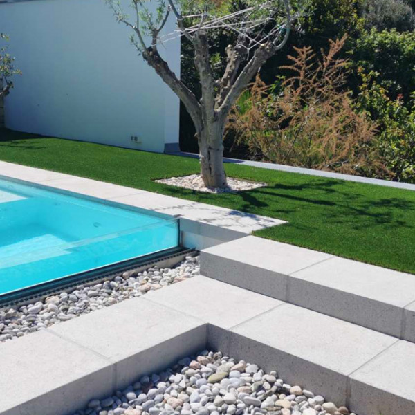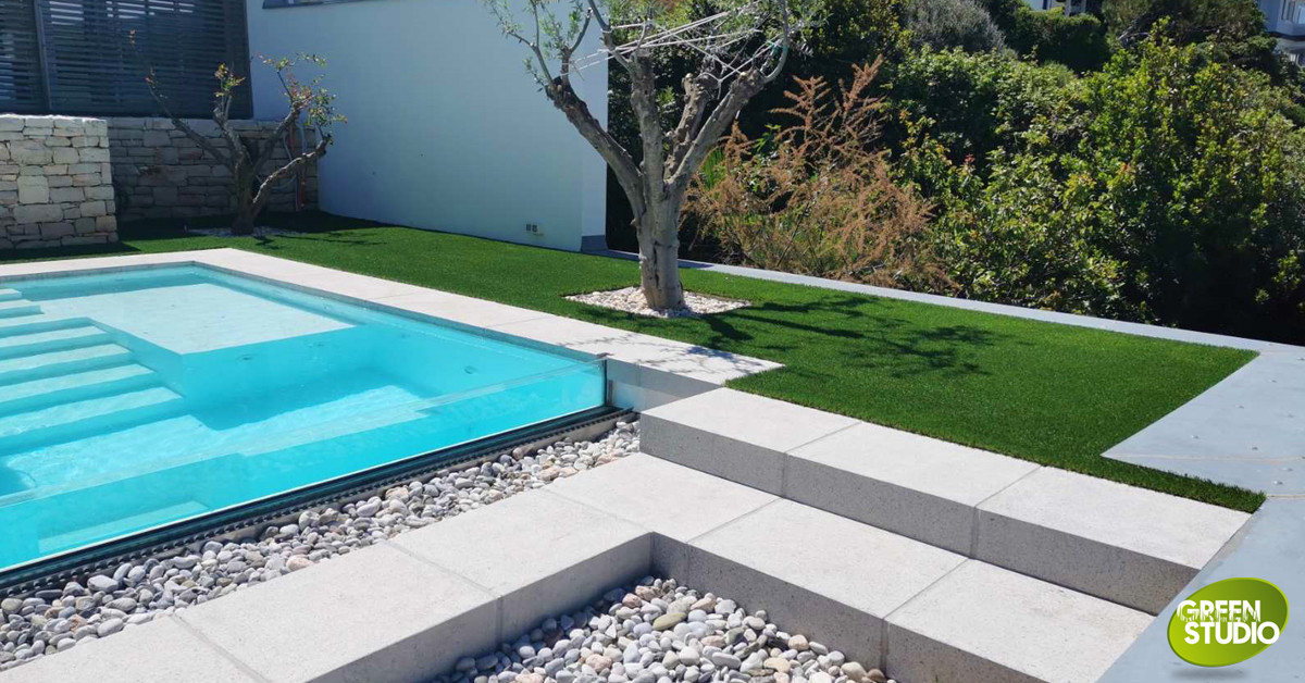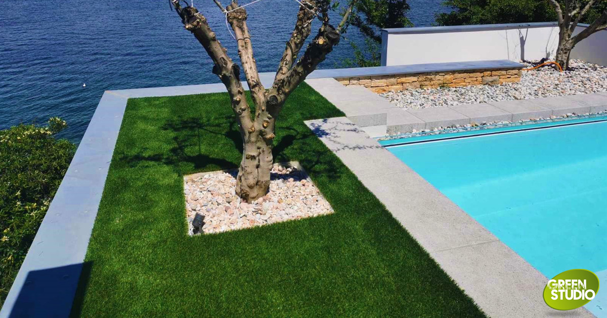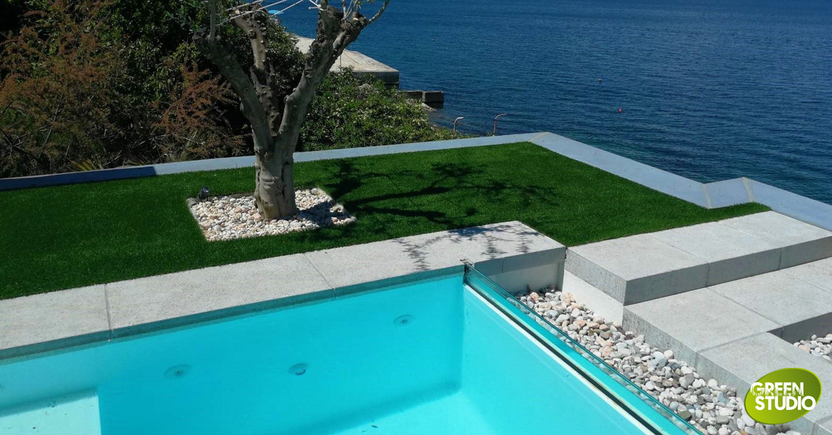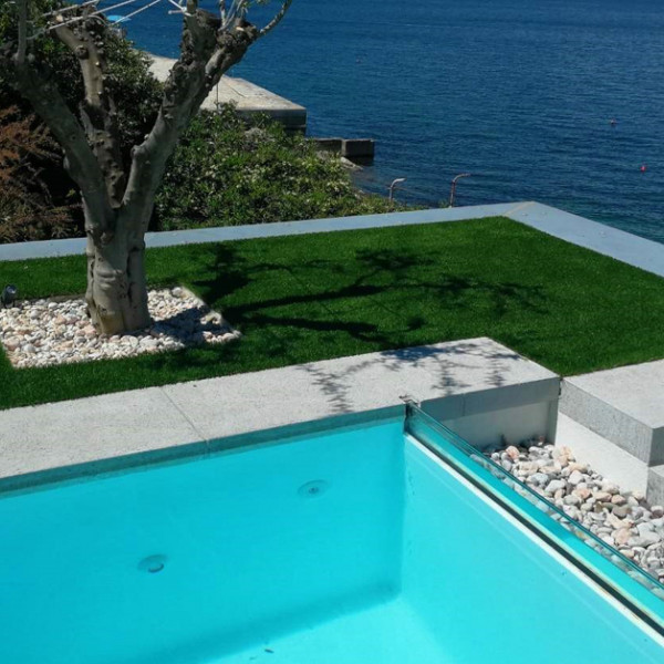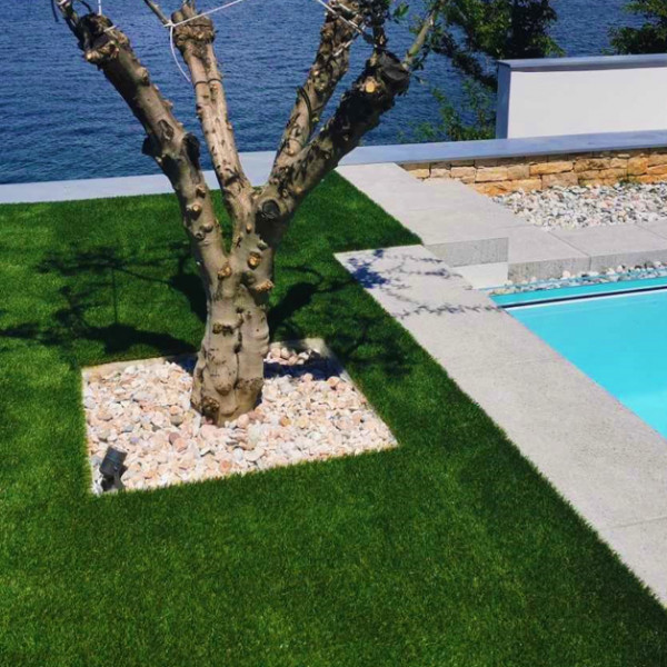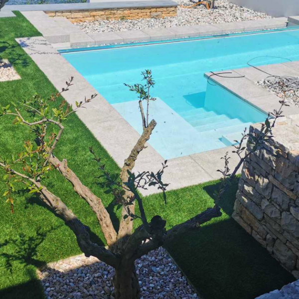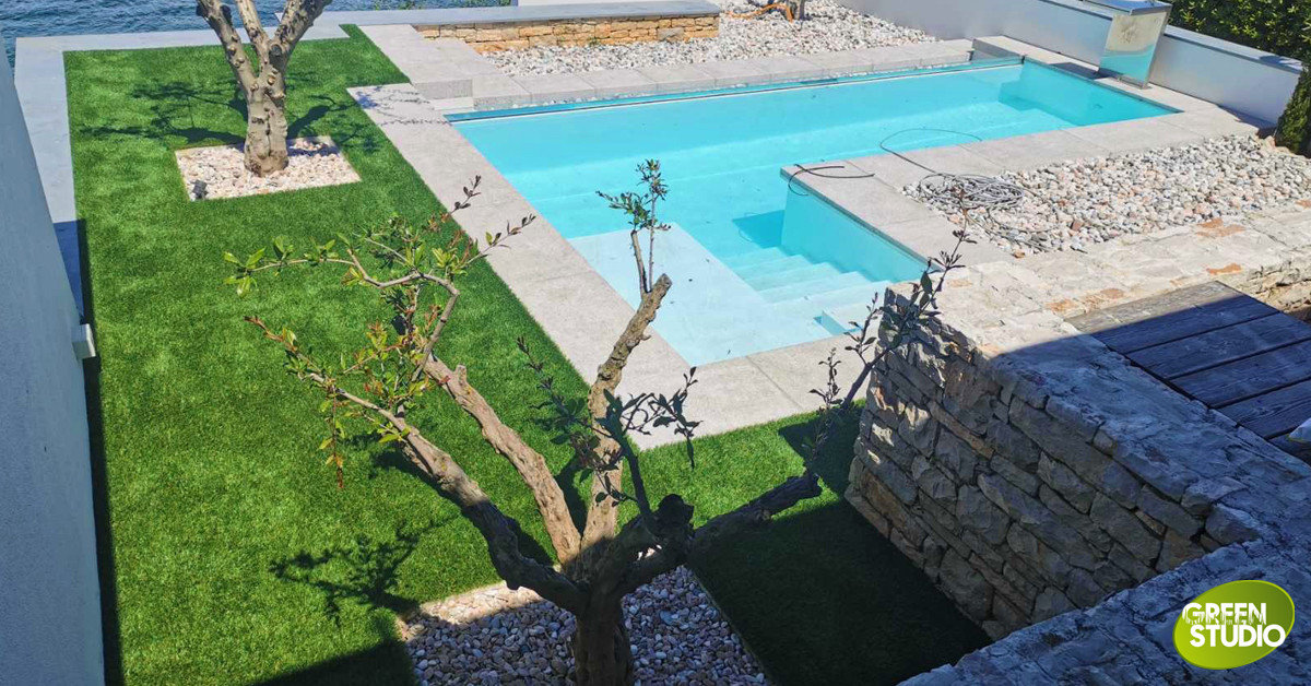 A poleg bazena je pomembna tudi urejena okolica. Nedavno smo se mudili v Crvenem Vrhu pri Savudriji, kjer smo okoli bazena namestili umetno travo iz skupine Deluxe in višino 42 mm.