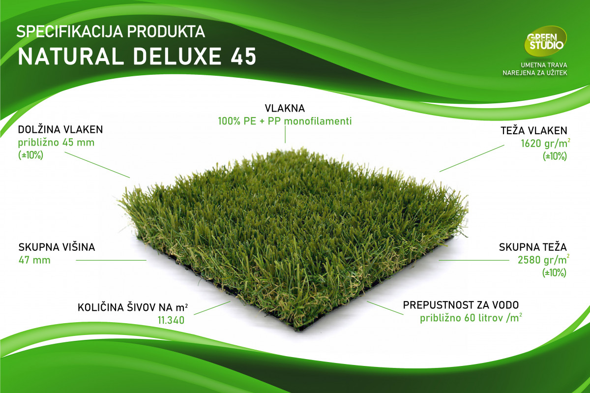 Eden glavnih izzivov današnjih umetnih trav je izdelati naravno in realistično umetno travo. Z zbirko Natural Deluxe® lahko svoje stranke presenetimo tako, da jim pokažemo kako zelo naravne so naše umetne trave. Ne samo, da smo mešali barve, da se ujemajo z barvo trave, ki jo najdete po vsej Evropi, dodali smo tudi bež-zeleno obarvano korenino. Ta kombinacija omogoča, da kolekcija Natural Deluxe® izgleda bolj naravno in realistično kot prava stvar. Najpomembneje pa je, da smo našli način, kako bi naša trava izgledala bolj naravno kot večina trav na trgu.