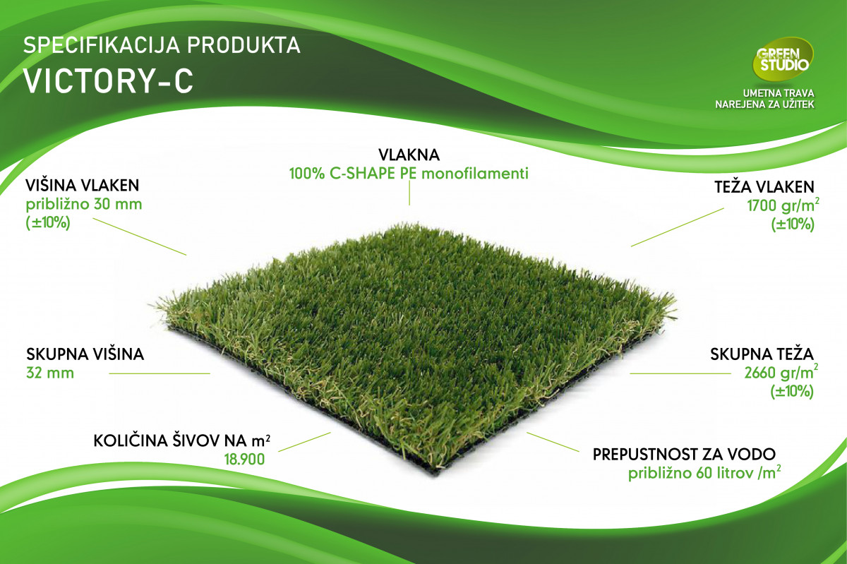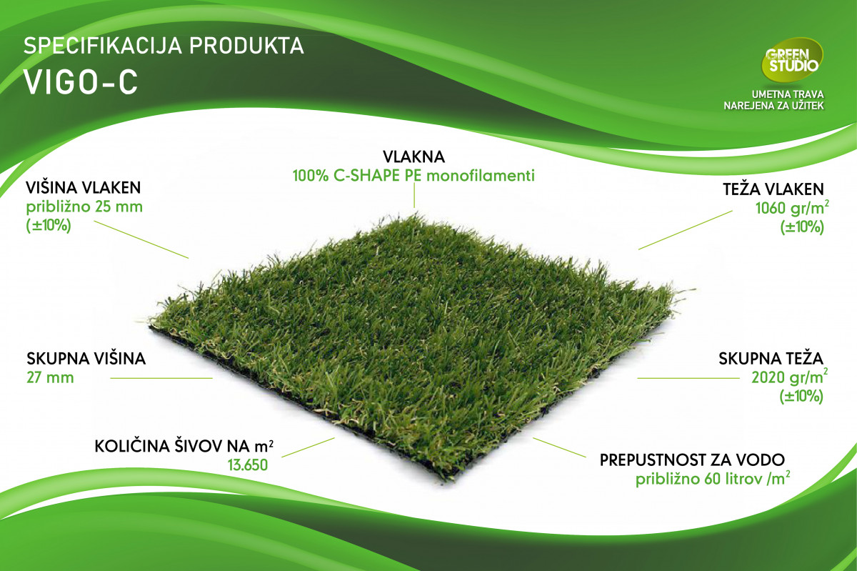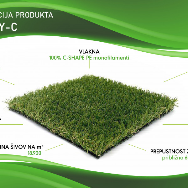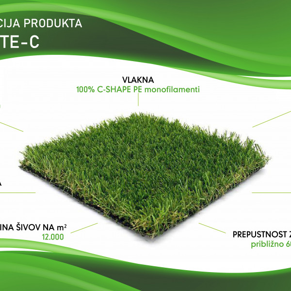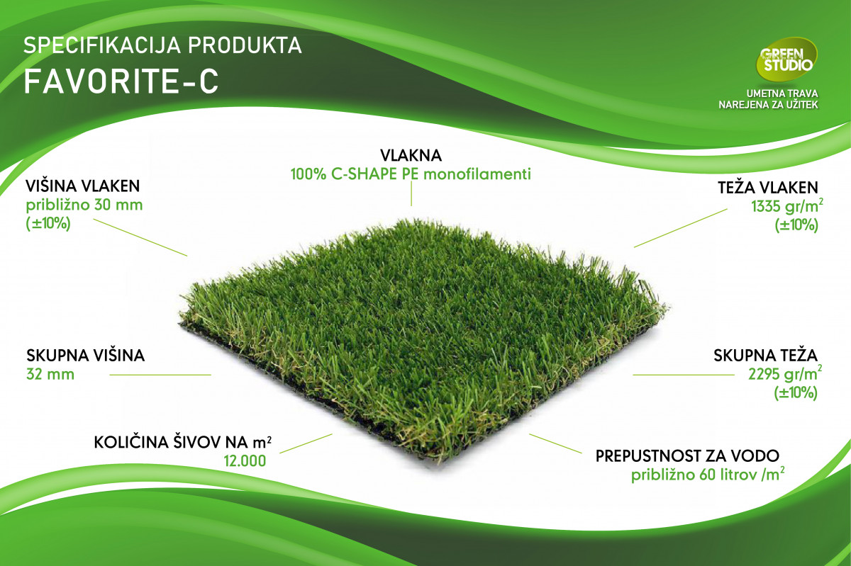 Kolekcija umetnih trav Greenstudio z vlakni oblike črke C je ena najbolj inovativnih umetnih trav, ki so na voljo na trgu. Zahvaljujoč pametnemu inženiringu, ki temelji na željah zahtevnega potrošnika, smo uspeli ustvariti umetno travo, ki je neverjetno odporna. Skrivnost je v edinstveni obliki polmeseca in uporabi polimerov najnovejše generacije. Tako so naša vlakna C-oblike ena izmed najbolj odpornih vlaken, ki so na voljo na današnjem trgu. Preskusi so pokazali, da je C-oblika do dvakrat bolj odporna v primerjavi z drugimi umetnimi vlakni za umetne trave. Odpornost je ključna!